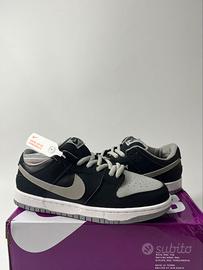The Nike SB Dunk Low J-Pack Shadow features a black, white, and Shadow Grey leather and suede upper, with black being the predominant shade for most of this model. From there, a swooping Shadow Grey "Swoosh" design looping back toward Nike lettering on the heel and a white "Zoom Air" unit in the heel complete the design.