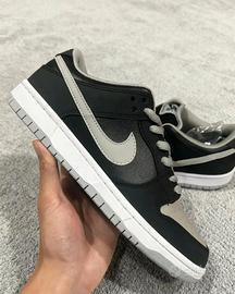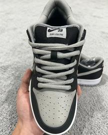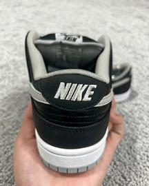 The Nike SB Dunk Low J-Pack Shadow features a black, white, and Shadow Grey leather and suede upper, with black being the predominant shade for most of this model. From there, a swooping Shadow Grey "Swoosh" design looping back toward Nike lettering on the heel and a white "Zoom Air" unit in the heel complete the design.