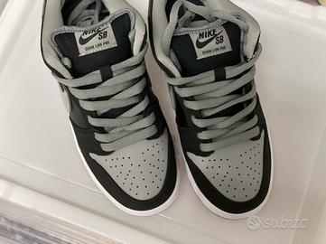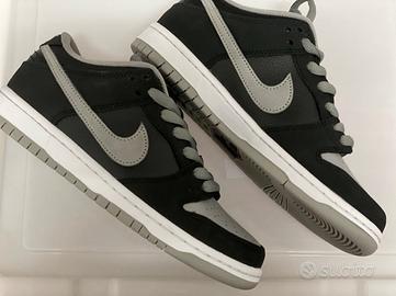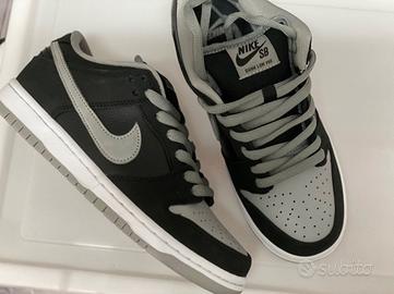 The Nike SB Dunk Low J-Pack Shadow features a black, white, and Shadow Grey leather and suede upper, with black being the predominant shade for most of this model. From there, a swooping Shadow Grey "Swoosh" design looping back toward Nike lettering on the heel and a white "Zoom Air" unit in the heel complete the design.