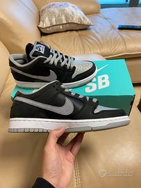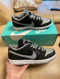 The Nike SB Dunk Low J-Pack Shadow features a black, white, and Shadow Grey leather and suede upper, with black being the predominant shade for most of this model. From there, a swooping Shadow Grey "Swoosh" design looping back toward Nike lettering on the heel and a white "Zoom Air" unit in the heel complete the design.