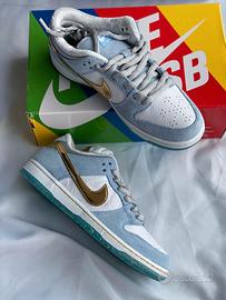 The Nike SB Dunk Low Sean Cliver is filled with holiday cheer. The upper holds a mix of sky blue suede and white tumbled leather, adding luxe looks to the skateboarding sneaker. Next, a metallic gold Swoosh shines on the upper as well, matching a gold speckled, blue outsole and gold embroidered Nike logo on the heel. The sneaker's toe displays air holes patterned after snowflakes, while the insoles continue the festive design by showcasing Christmas elves painting holiday toys.