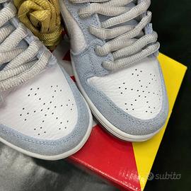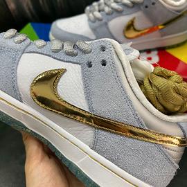 The Nike SB Dunk Low Sean Cliver is filled with holiday cheer. The upper holds a mix of sky blue suede and white tumbled leather, adding luxe looks to the skateboarding sneaker. Next, a metallic gold Swoosh shines on the upper as well, matching a gold speckled, blue outsole and gold embroidered Nike logo on the heel. The sneaker's toe displays air holes patterned after snowflakes, while the insoles continue the festive design by showcasing Christmas elves painting holiday toys.