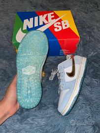 The Nike SB Dunk Low Sean Cliver is filled with holiday cheer. The upper holds a mix of sky blue suede and white tumbled leather, adding luxe looks to the skateboarding sneaker. Next, a metallic gold Swoosh shines on the upper as well, matching a gold speckled, blue outsole and gold embroidered Nike logo on the heel. The sneaker's toe displays air holes patterned after snowflakes, while the insoles continue the festive design by showcasing Christmas elves painting holiday toys.