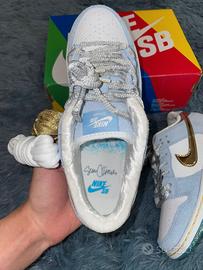 The Nike SB Dunk Low Sean Cliver is filled with holiday cheer. The upper holds a mix of sky blue suede and white tumbled leather, adding luxe looks to the skateboarding sneaker. Next, a metallic gold Swoosh shines on the upper as well, matching a gold speckled, blue outsole and gold embroidered Nike logo on the heel. The sneaker's toe displays air holes patterned after snowflakes, while the insoles continue the festive design by showcasing Christmas elves painting holiday toys.