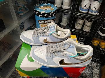 The Nike SB Dunk Low Sean Cliver is filled with holiday cheer. The upper holds a mix of sky blue suede and white tumbled leather, adding luxe looks to the skateboarding sneaker. Next, a metallic gold Swoosh shines on the upper as well, matching a gold speckled, blue outsole and gold embroidered Nike logo on the heel. The sneaker's toe displays air holes patterned after snowflakes, while the insoles continue the festive design by showcasing Christmas elves painting holiday toys.