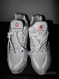 Scarpe Nike Shox in una combinazione di colori argento e bianco.