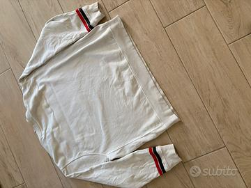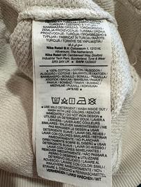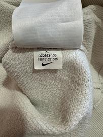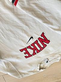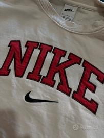 Felpa Nike vintage originale, colore bianco panna con maxi logo ricamato rosso e swoosh nero frontale. Stile retrò anni 90/2000, perfetta per outfit streetwear. Dettagli particolari con bande rosse e nere sui polsini. Taglia XL ma veste anche L (fit leggermente oversize). Condizioni buone: presenta qualche piccola macchia poco visibile, per il resto in ottimo stato.