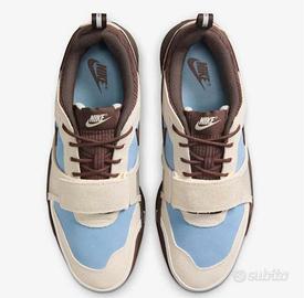 Le Nike Zoom Field Jaxx Travis Scott Leche Blue, mescolano tonalità Leche Blue, Baroque Brown e Pale Ivory, per un effetto visivo audace ma equilibrato. I materiali sono di alta qualità: la tomaia è realizzata in pelle e suede premium, con inserti in mesh traspirante che migliorano il comfort durante l’uso quotidiano. Un dettaglio che segna una svolta rispetto alle collaborazioni precedenti è il ritorno allo Swoosh Nike tradizionale, al posto di quello rovesciato diventato simbolo delle precedenti uscite Cactus Jack. Non manca però l’iconico logo smiley Cactus Jack sul tallone, inserito in maniera più discreta ma comunque riconoscibile.
