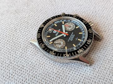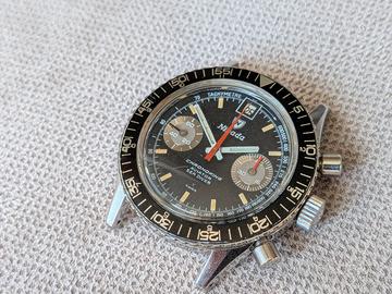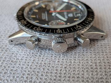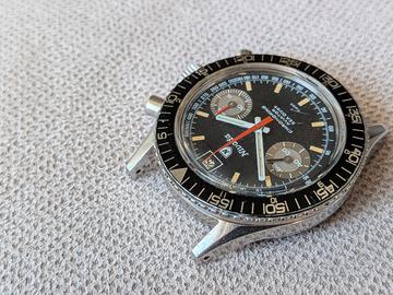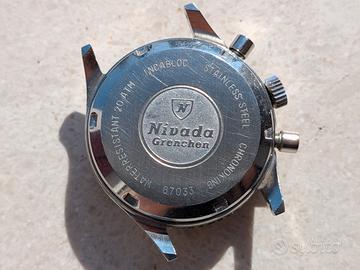 Non scambio e non permuto. Dalla mia collezione privata cedo questo raro cronografo vintage della Nivada Grenchen, modello Chronoking Aviator Sea Diver prodotto tra la fine degli anni 60 e l'inizio degli anni 70. Quadrante dell'orologio in perfette condizioni con datario e i particolari contatori a specchio. Movimento Valjoux 234, funziona ma non conosco la data di ultima revisione. Corona logata, cassa in ottime condizioni, il vetro in plexiglass presenta dei graffi. Spedizione assicurata o consegna a mano. Pagamento tramite bonifico/contanti/ PayPal amici. Chiedo cortesemente serietà e no perditempo.
