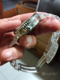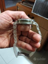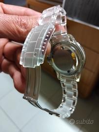 orologio simpatico in quanto con cassa e bracciale in plexiglass. leggerissimo al polso ed alla vista. non conosco la data dell' ultima revisione (se mai ne ha fatta una) ma al momento funziona. dimensioni da uomo