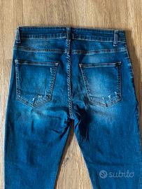 Jeans skinny fit in denim blu con dettagli strappati e effetto vissuto.