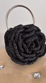 Borsa couture artigianale realizzata a mano con lavorazione scultorea a rosa tridimensionale. Il filato nero leggermente luminoso cottura la luce creando profondità e movimento, mentre il manico rigido in metallo aggiunge un tocco raffinato e contemporaneo. Un accessorio esclusivo, pensato come pezzo statement per eventi e occasioni speciali. Creazioni handmade unica, curata nei minini dettagli.