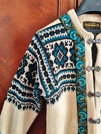 Autentico cardigan norvegese in pura lana del marchio Nordstrikk, che con Dale of Norway rappresenta uno dei più noti brand di maglieria norvegese. I capi in maglia scandinavi sono rinomati per il loro tepore, la qualità delle materie prime e per il fatto di essere realizzati artigianalmente, oltre che per la loro bellezza. Nel tipico stile nordico, il cardigan presenta dei motivi geometrici a fiocco di neve in verde-blu su fondo crema, si chiude con i tipici alamari in metallo, ed è decorato con passamaneria ricamato in turchese.