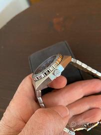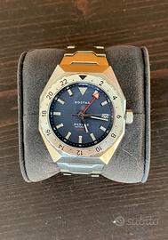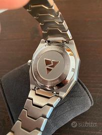 Cassa: Acciaio inossidabile 316L satinato da 39 mm, forma ottagonale/circolare, spessore 12,90 mm, lug-to-lug 45,30 mm. Movimento: Automatico, calibro Seiko NH34 GMT con 41 ore di riserva di carica. Ghiera: Bidirezionale, 120 scatti, in acciaio Quadrante: Motivo a triangolini (tapisserie), indici/sfere color oro rosa o acciaio, lancetta GMT rossa, datario a ore 3. Vetro: Zaffiro con trattamento antiriflesso e proprietà oleofobiche. Impermeabilità: 200m (20ATM), corona a vite. Bracciale: Integrato in acciaio con chiusura a farfalla, sistema di sgancio