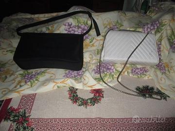 Nr. 2 borse eleganti da sera: la 1^ è nera da spalla con patta e 1 tasca all'interno, la 2^è bianca trapuntata con lunga tracolla in metallo, è foderata, ha tasca interna. Disponibili, per cambio guardaroba, altre borse da sera, per la città, per le escursioni, zaini, beauty-case, pochette per il trucco e portatutto, portafogli, scarpe, stivali, sandali, cinture, foulard e sciarpe gradi e piccole, cravatte anni 70-80-90, cappelli, guanti, bijoux, portagioie + abbigliamento per donna, uomo, bambino per 4 stagioni, anche taglie calibrate
