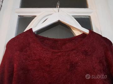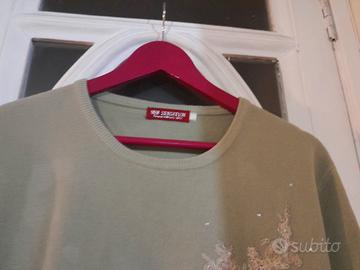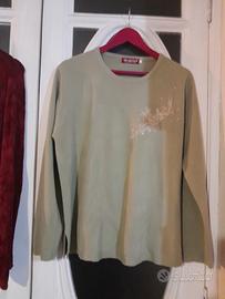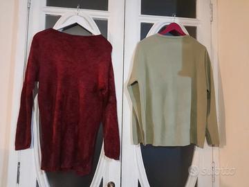 Nr. 2 pullover taglia L scollo tondo: il 1 ° color rossiccio, peloso (costa € 2); il 2° color verde chiaro, molto di tendenza, con 1 bel ricamo con strassetti in alto a sinistra (costa € 4). Disponibili, per cambio guardaroba, altri pullover a collo alto, scollo tondo e a V, cardigan, sottogiacca, camicie, polo, gilet, alcuni capi per cerimonia per donna (1 abito da cerimonia, 1 abito da sposa, coprispalle, gonne, veli, corsetti, 1 stola in ecopelliccia per spose d'inverno, 1 paio di scarpe color avorio a punta con cristalli mis. 39), shorts, bermuda, leggings, pantaloni, gonne, pigiami, camicie da notte, vestaglie, abiti interi e da abbinare, tailleur, alcuni abiti da lavoro, capi di jeans (pantaloni, salopette premaman, gonne, camicie), smanicati, giubbini, giacche, giacconi e cappotti anche imbottiti, impermeabili per donna,uomo, bambino per 4 stagioni, anche taglie calibrate + borse per la città e per le escursioni, zaini, scarpe, stivali, sandali, beauty-case, pochette per il trucco e portatutto, cinture, foulard e sciarpe grandi e piccole, cravatte anni 70-80-90, cappelli, guanti, bijoux, portagioie