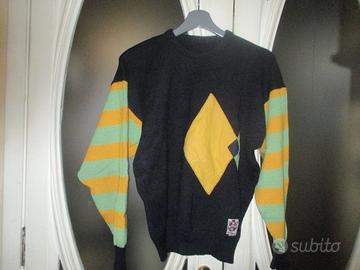 Nr. 4 pullover per uomo: il 1° è un cardigan "Zara" tg. S a collo alto chiuso da zip con una fantasia a scacchi tono su tono color nero (€ 4); il 2° è un pullover a girocollo taglia M nero, giallo e verde chiaro (€ 3); il 3° è un pullover taglia XL a girocollo nero a righe gialle, rosse, blu e verdi (€ 3); il 4° è un pullover taglia XL scollo a V a righe colore grigio chiaro e scuro, bianco, beige, azzurro, rosso e celeste, elastico, molto estensibile (€ 3). Disponibili, per cambio guardaroba, altri pullover, scollo a V e tondo, a collo alto, cardigan, sottogiacca, camicie, polo, gilet, pigiami, camicie da notte, vestaglie, alcuni capi per cerimonia per donna (1 abito da sera, 1 abito da sposa, 1 tuta con le spalle scoperte, coprispalle, gonne, veli, corsetti, 1 stola in ecopellicia color avorio per spose d'inverno, 1 paio di scarpe da sposa color avorio a punta con cristalli mis. 39), gonne, shorts, bermuda, leggings, pantaloni, abiti interi e da abbinare, tailleur, alcuni abiti da lavoro, capi di jeans (pantaloni, salopette premaman, gonne, camicie), giacconi e cappotti anche imbottiti, giacche, giubbini, smanicati, impermeabili, 3 giacconi: 2 di vero montone, 1 di vera pelliccia di lapin, 1 collo di vera pelliccia per donna, uomo, bambino per 4 stagioni, anche taglie calibrate + accessori: borse per la città e per le escursioni, zaini, beauty-case, pochette per il trucco e portatutto, portafogli, scarpe, stivali, sandali, cinture, foulard e sciarpe grandi e piccole, cravatte anni 70-80-90, cappelli, guanti, bijoux, portagioie