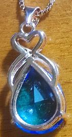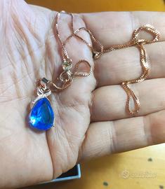 Nuova collana con pendente in argento 925 placcato oro 14 ct rosa con topazio blu a goccia.