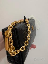 NUOVA con etichetta! Pochette Vicolo nera effetto coccodrillo, mai usata. Borsa a mano elegante e moderna con logo "V" e catena spessa color oro. Un accessorio versatile, perfetto per serate o cerimonie. Condizioni impeccabili, ancora con la sua dustbag