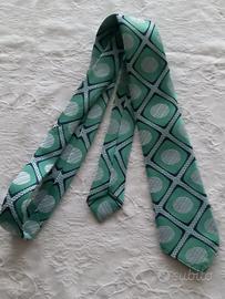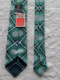 Cravatta classica vintage originale sfondo verde, disegni blu e bianchi, marca Terital Rhodiatoce.