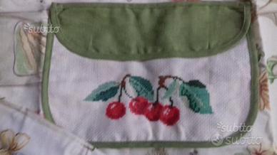 Confezionata in tessuto di cotone stampato, con capiente tasca in tela Aida ricamata a mano a punto croce con rovescio perfetto.