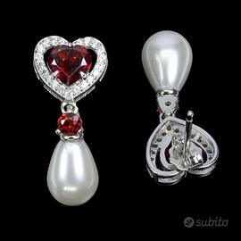Nuovi Orecchini a forma di cuore con granato del Mozambico e perle in argento 925 placcato oro 14k