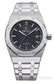 Oblvlo. Royal Oak homage. Movimento meccanico a carica automatica Miyota 8215 visibile dal fondello. Cassa da 41 mm di diametro in acciaio inossidabile 316L. Spessore cassa 11,0 mm. Quadrante ardesia. Data. Vetro hardlex. Bracciale in acciaio inossidabile 316L. Orologio messo a misura ma mai indossato. Nuovo con dotazione completa Full Set. Splendido.