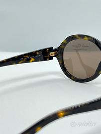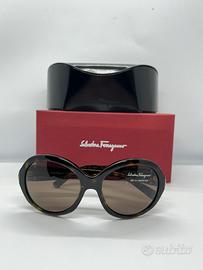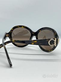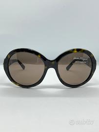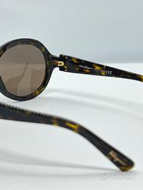 Montatura da sole Ferragamo Modello: 2174 Calibro e ponte: 56-17 Lunghezza asta: 130 Condizione: mai indossato Descrizione Montatura da donna Ferragamo. Serigrafia del logo su lente destra. Presente etichetta originale su lente sinistra. Forma tonda con motivo tartarugato. Dettagli del logo in metallo sulle astine e logo alla fine del terminale dell’astina. Sono compresi anche custodia e pezze originali.