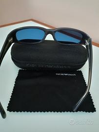 Occhiale da sole uomo Emporio Armani di colore nero, lenti blu nero. Occhiale come nuovo pochissimo utilizzo, compreso di custodia e pezza per pulire gli occhiali tutto originale