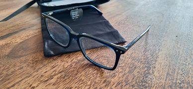 Montatura elegante e moderna, forma leggermente squadrata, colore Blue scuro con effetto trasparente molto raffinato.