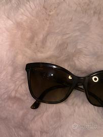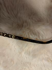Montatura in acetato tartarugata lucida aste e zona sopraccigliare, tartarugata satinata con lente a gatta squadrata marrone sfumata.