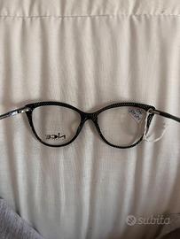 Vendita da inventario del nostro negozio di famiglia. Elegante montatura da vista femminile del brand NICE Collection, interamente Made in Italy. Il modello presenta una forma cat-eye (a gatto) molto decisa, con una particolare trama testurizzata sui toni del nero e grigio scuro che ricorda un effetto tessuto o carbonio, impreziosita da una finitura leggermente brillante. Provenendo direttamente dal magazzino del nostro negozio, gli occhiali sono nuovi e mai usati. Montano lenti dimostrative trasparenti con logo, pronte per essere sostituite dal tuo ottico di fiducia. Dettagli Tecnici (incisi sulle aste): - Modello: MC1079 - Colore: P3-34 (Nero lavorato / Texture scura) - Misure: 54 $\square$ 17 - 140 - Larghezza lente: 54 mm - Ponte: 17 mm - Lunghezza aste: 140 mm - Qualità: 100% Made in ItalyCondizioni e Accessori: - Stato: Nuovo con cartellino del negozio ancora attaccato. - Custodia: Inclusa (custodia rigida nera visibile in foto). - Garanzia: Articolo originale da attività commerciale di famiglia.