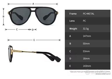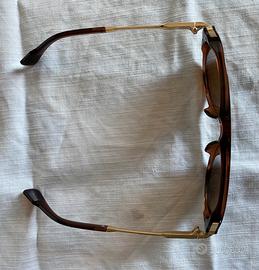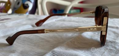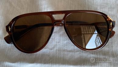 Occhiali da sole unisex modello pilota a goccia colore marrone con staffe oro, nuove mai indossate. Misure di riferimento nell’ultima foto.