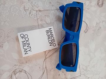 colore azzurro la montatura, lenti scure.