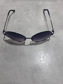 Occhiali da sole rotondi, lenti sfumate. Montatura sottile in metallo.