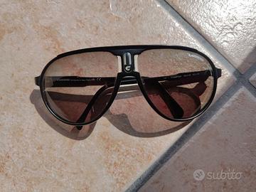 Occhiali Carrera Champions di colore nero, presentano piccoli segni di usura alle estremità delle lenti (come evidenziato nelle immagini) che non compromettono la visuale. Vengono forniti con astuccio e pezza pulitrice.