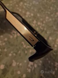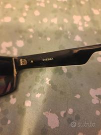 Occhiali da Sole Diesel Originali - Modello Sportivo Wrap-around - Vintage anni 2000 In vendita occhiali da sole Diesel originali, caratterizzati da un design avvolgente e grintoso, ideale per chi ama uno stile urban e sportivo. Dettagli del Design: Brand: Diesel. Montatura: In acetato nero lucido, forma rettangolare avvolgente. Aste: Molto particolari, decorate con una placca metallica color canna di fucile/oro con texture a rilievo e logo Diesel inciso. Lenti: Scure, offrono un'ottima protezione e un look deciso. Condizioni: L'accessorio è usato. La montatura è solida e i loghi sono ben visibili.