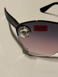 Occhiali da sole da donna Miu Miu modello Enchant, NUOVI e MAI INDOSSATI, completi di confezione originale. Ampia montatura avvolgente in metallo color oro pallido, impreziosita da vistosi cristalli e un elegante fiocco in raso. Lenti sfumate grigio/viola in policarbonato, con protezione UVA/UVB 100%. Naselli regolabili per un comfort personalizzato. Misure: • Larghezza lente: 58 mm • Altezza lente: 47,3 mm • Ponte: 158 mm • Asta: 120 mm