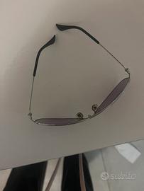 Occhiali da sole da donna con montatura argento e lenti viola.