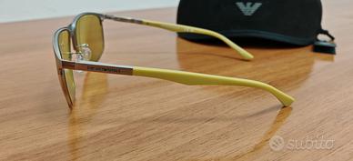 Occhiali da sole Emporio Armani EA2094, colore argento opaco con aste giallo chiaro e lenti a specchio verde.