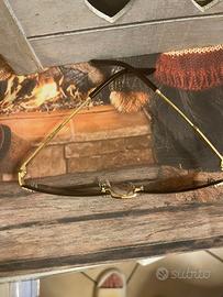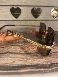 Si tratta di un paio di occhiali da sole con montatura a giorno (rimless), caratterizzati da lenti rettangolari scure con sfumatura nera. La struttura è sorretta da un ponte e aste in metallo dorato, arricchite da piccoli dettagli decorativi che donano un tocco elegante e leggermente vintage. Le aste terminano con finali neri, garantendo comodità e stabilità. Lo stile complessivo è raffinato ma deciso, ideale per chi vuole un look distintivo e sofisticato.