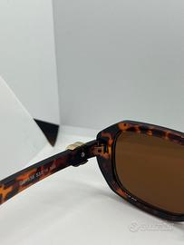 Eleganti occhiali da sole Gucci, modello rettangolare con montatura marrone effetto tartarugato e lenti marroni.