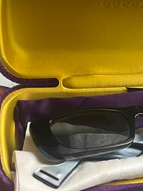 Occhiali da sole di forma rettangolare, lente chiara con protezione UV. II portaocchiali consiste in una custodia rigida + sacchetto con coulisse. Panno per pulire le lenti presente.