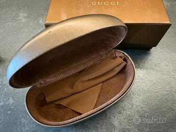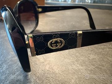 Vendo occhiali da sole Gucci originali, modello oversize con montatura nera lucida e logo GG dorato laterale con motivo monogram.