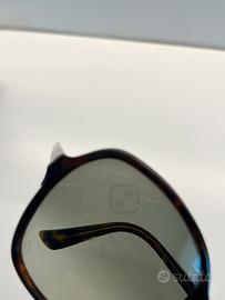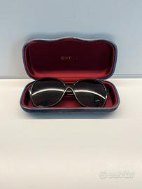 Occhiali da sole Gucci originali. Modello femminile. Colore marrone scuro. Lente grande. La lente presenta dei graffi, mentre la montatura no. L’occhiale è completo di custodia originale anche se segni di usura. La custodia è rigida e di velluto blu.
