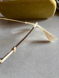 Vendesi occhiali da sole Gucci, anno 2018, lente yellow con particolari brillantinati intorno alla lente, asticelle in madreperla con logo, pari al nuovo, completi di scatola in velluto