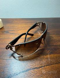 Splendido paio di occhiali da sole Gucci originali, modello a mascherina (shield) dal design tipico dei primi anni 2000. Gli occhiali sono integri, non sono mai stati indossati; come visibile in foto, la custodia originale mostra segni di usura dovuti al tempo, ma svolge ancora perfettamente la sua funzione protettiva.