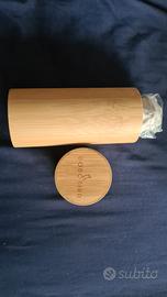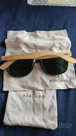 Occhiali da sole unisex, in legno colore chiaro, particolare colore delle lenti giallo specchiato. Vendo completo di pezzuola per pulire le lenti, portaocchiali di stoffa, portaocchiali di legno, scatola.