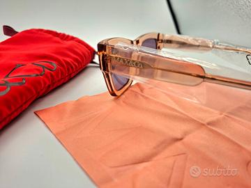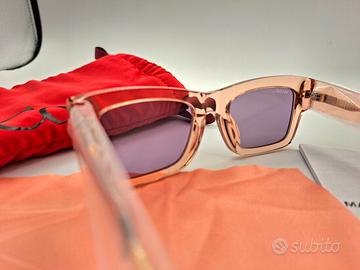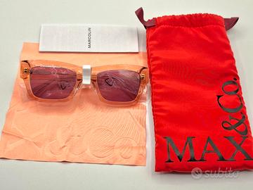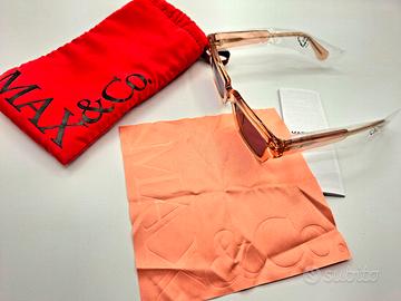 Occhiali da sole Max & Co. con montatura rosa trasparente e lenti viola. - Custodia in tessuto rosso con logo Max & Co. - Panno per la pulizia. - Documentazione Marcolin.