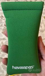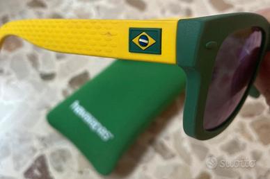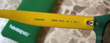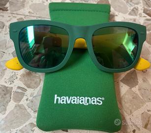 Occhiali da sole uomo, marca HAVAIANAS, modello PARATY/M, misure 50/21 145, colore verde e giallo. Condizioni ottime, nel suo astuccio originale, non presente la pezza per la pulizia.